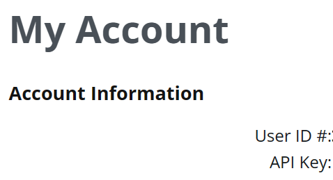 After logging in you will see your account information. Under My Account, you can see your User ID # as well as your API Key, take note of the key because you will need it later.