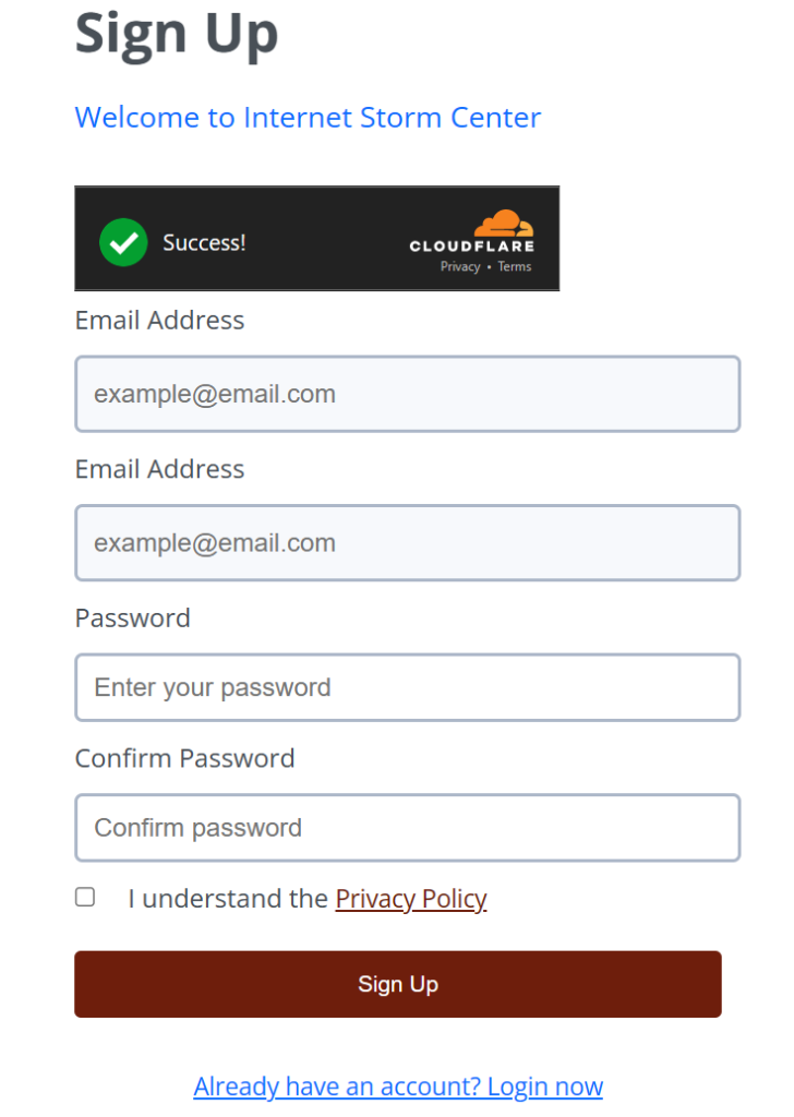 Before you start installing DShield, first sign up for an account on Internet Storm Center through this link: Register – SANS Internet Storm Center. Enter the required information and click Sign Up.