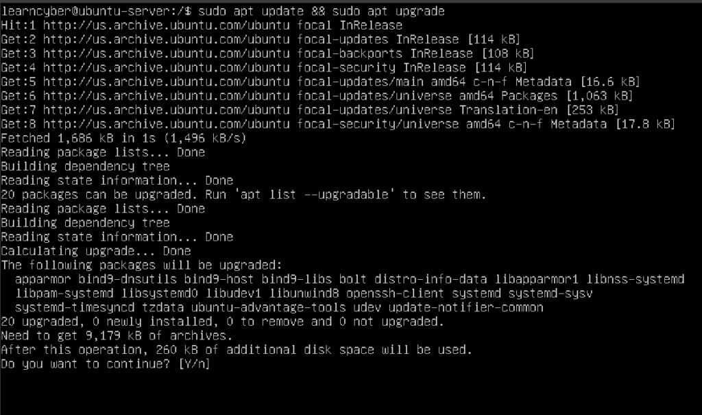learncyber@ubuntu-server:/$ sudo apt update && sudo apt upgrade