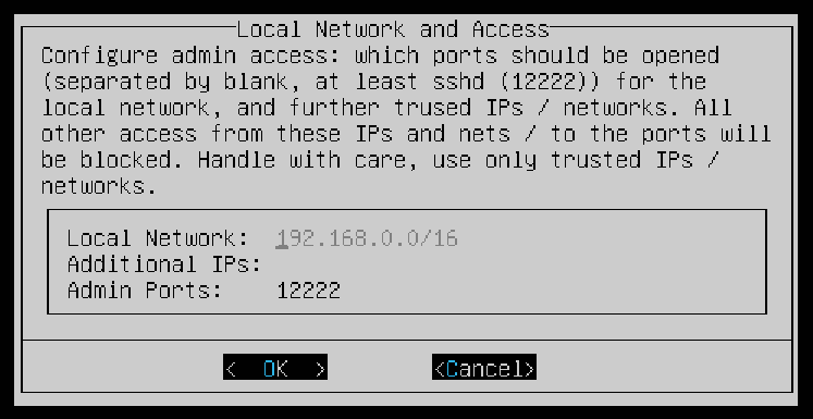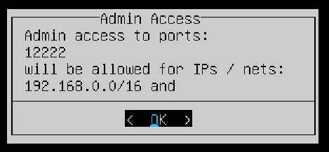 The next step will configure admin access, you can just leave it at default then OK.