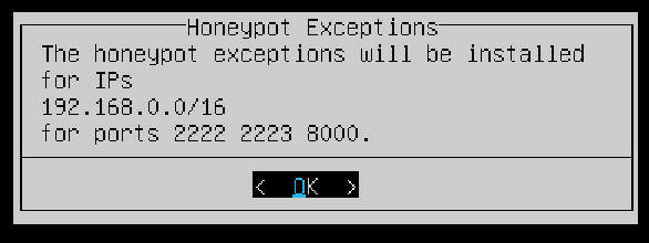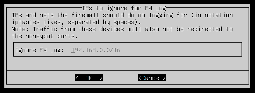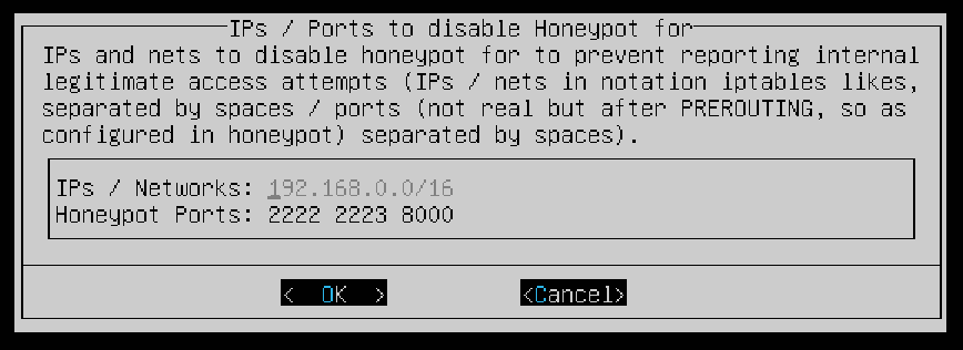 The next screen allows you to enter IPs and Ports to disable the honeypot for to prevent reporting internal access attempts. Again, ensure your local network is entered in the field. You can leave the default options for the Honeypot Ports then OK.