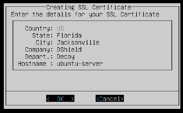 In the following screen you can create an SSL certificate. You can opt to use the default information given or enter your own. Select OK when you’re done.