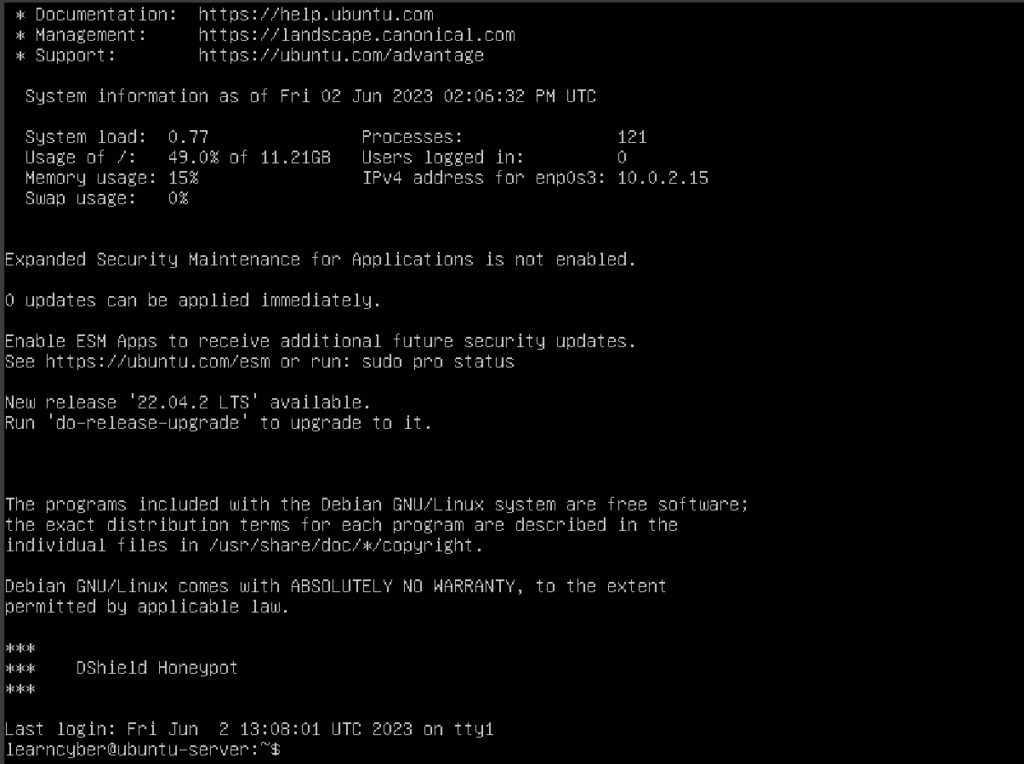 After rebooting, you will notice the line saying “DShield Honeypot“, this indicates that you have successfully turned your Ubuntu Server into a honeypot, however, it’s still not accessible from the public internet. To do so, you need perform a few more configurations.