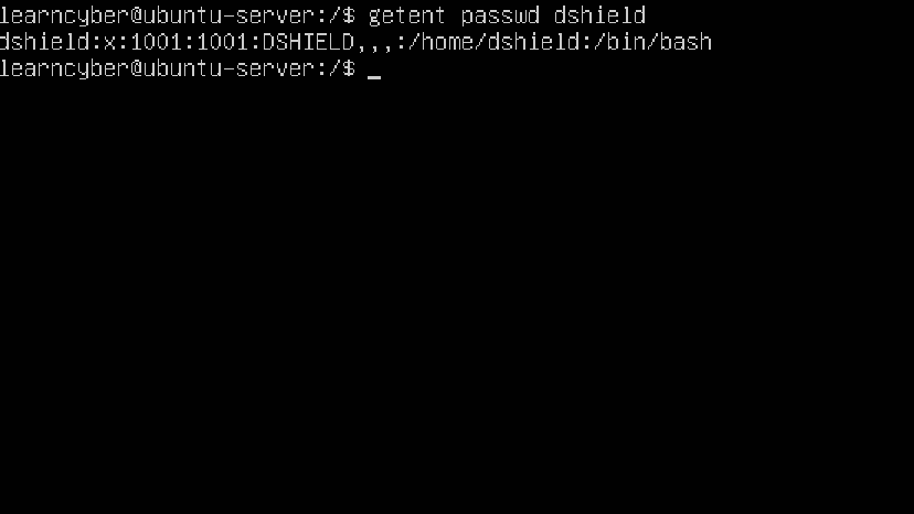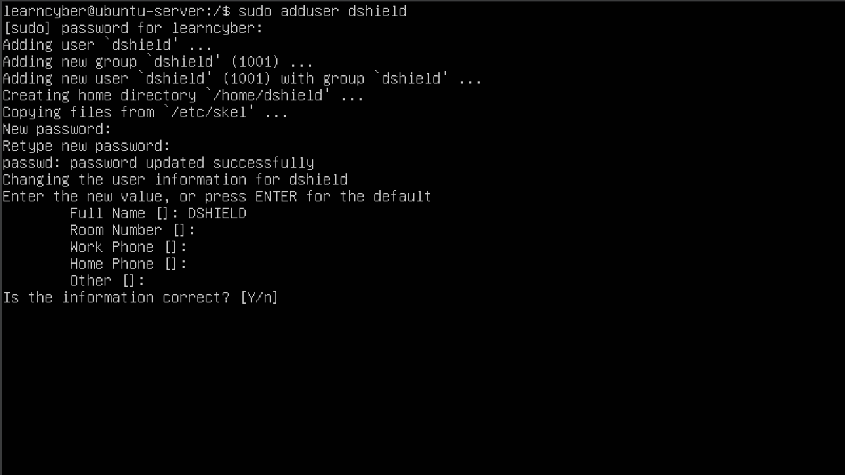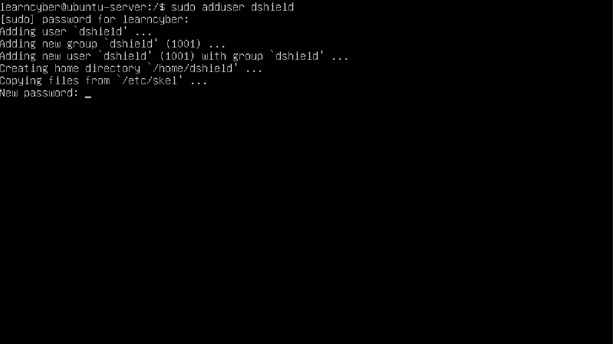 learncyber@ubuntu-server:/$ sudo adduser dshield
