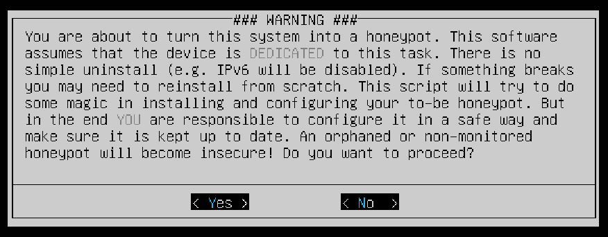 You will be prompted with a WARNING message verifying that you’re aware that you’re turning the system into a honeypot. Select Yes to proceed.